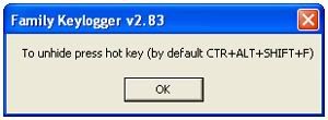 Dari Gambar 10, Kemudian klik OK untuk menyembunyikan. Kita diberitahukan bahwa untuk melihat kembali icon yang telah disembunyikan adalah dengan menekan kombinasi huruf Ctrl+ALT+Shift+F atau untuk Software Keylogger yang lain default kombinasinya Ctrl+Alt+Shift+K.