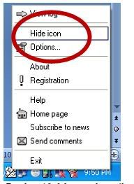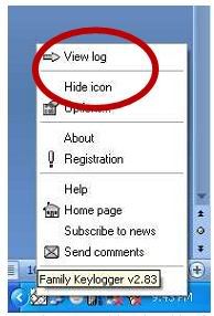 Icon Keylogger biasanya disembunyikan. Tidak akan kelihatan seperti itu di icon systray. Cara menyembunyikan adalah dengan klik Kanan Icon keylogger dan klik Hide Icon seperti Gambar 9 di bawah.